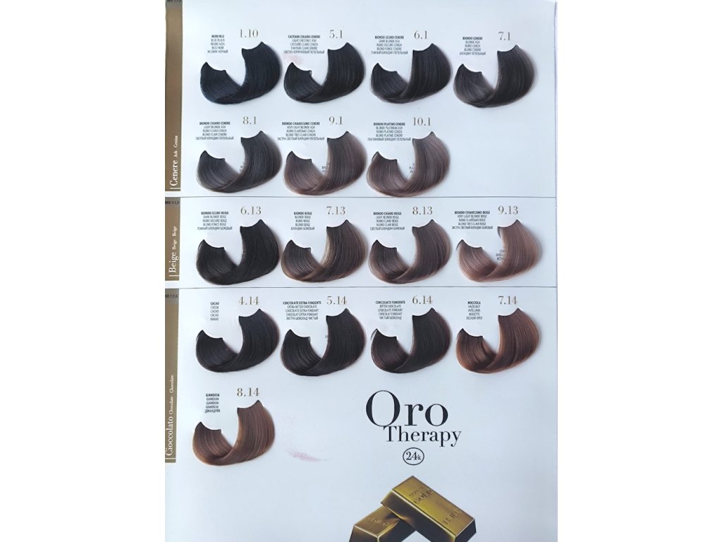 Oro Therapy je bezamoniaková profesionálna farba obohatená o keratín a mikroaktívne zlato, ktoré spoločne zabezpečujú rekonštrukciu, silu a maximálnu ochranu vlasového vlákna počas farbenia. Vhodná aj pre citlivú pokožku hlavy, poskytuje intenzívne, žiarivé odtiene, rešpektujúc prirodzenú rovnováhu vlasov.
